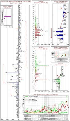 Началось сокращение объемов коротких позиций спекулянтов и длинных позиций хеджеров, которые ранее находились на исторических максимумах. Объем длинных спекулятивных позиций начал демонстрировать рост. Ситуация располагает к формированию сильных движений (причем в обе стороны). Вместе с тем закрытие коротких позиций спекулянтов в итоге приведет к формированию более сильного движения, которое может вылиться в восходящий тренд по EUR.