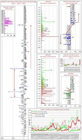 Объем коротких спекулятивных позиций значителен. Объем длинных спекулятивных позиций вблизи минимума. Ситуация располагает к формированию сильных движений (причем в обе стороны). Вместе с тем закрытие коротких позиций спекулянтов в итоге приведет к формированию более сильного движения, которое может вылиться в восходящий тренд по EUR.