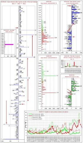 Началось сокращение объемов коротких позиций спекулянтов и длинных позиций хеджеров, которые ранее находились на исторических максимумах. Объем длинных спекулятивных позиций начал демонстрировать рост. Ситуация располагает к формированию сильных движений (причем в обе стороны). Вместе с тем закрытие коротких позиций спекулянтов в итоге приведет к формированию более сильного движения, которое может вылиться в восходящий тренд по EUR.