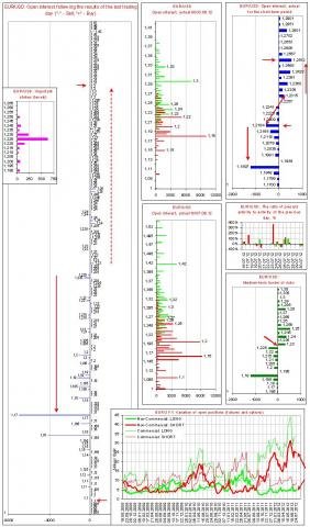 Объем коротких спекулятивных позиций значителен. Объем длинных спекулятивных позиций вблизи минимума. Ситуация располагает к формированию сильных движений (причем в обе стороны). Вместе с тем закрытие коротких позиций спекулянтов в итоге приведет к формированию более сильного движения, которое может вылиться в восходящий тренд по EUR.