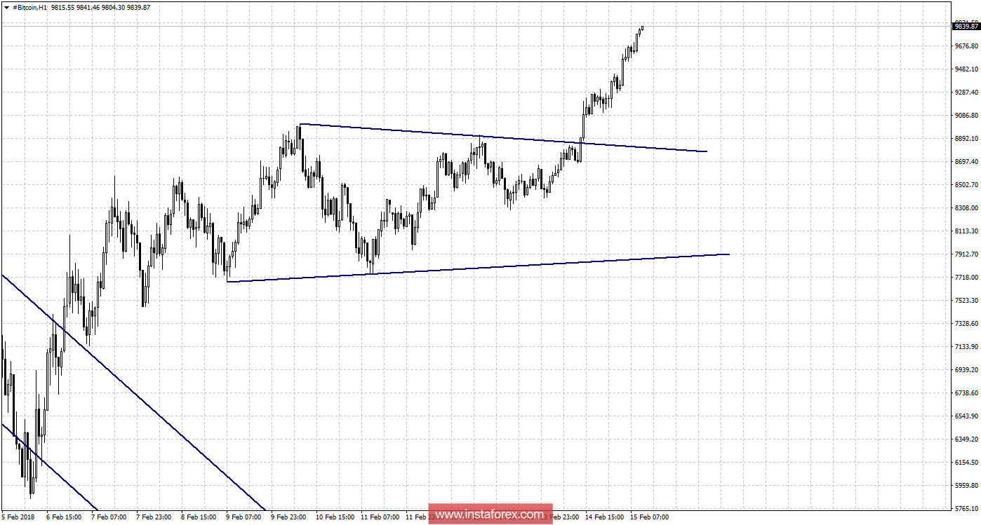 На часовом графике котировки «битка» закрылись над верхней границей сужающегося канала. Таким образом, возможно продолжение роста котировок.