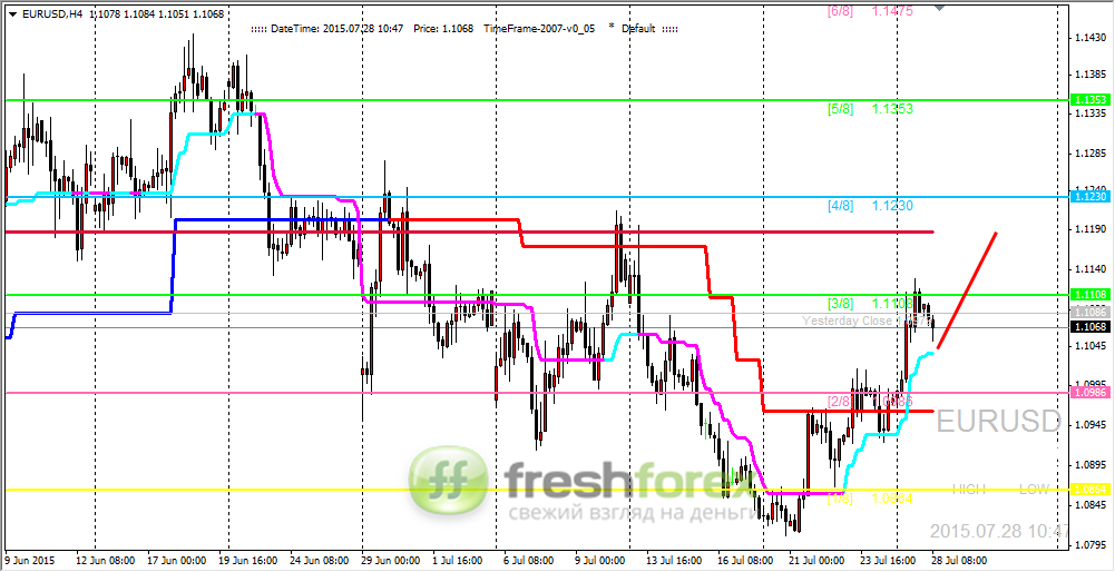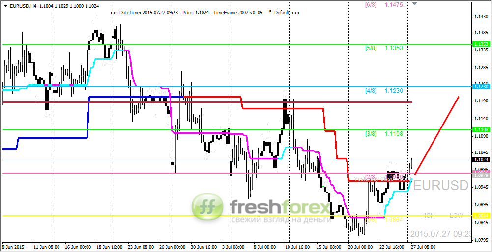 27 июля 2015, EUR/USD. Пара пытается закрепиться выше уровня (2/8).