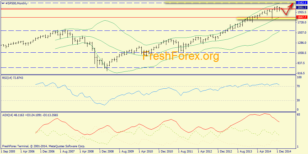 Месячный график: связка ADX/RSI определяет текущую тенденцию как начало возможной нисходящей коррекции. Возможная цель такой коррекции - средняя полоса Боллинджера (1847.7). Нужно понимать при этом, что быки продолжают доминировать и общая цель движения - верхняя полоса (2162.1). Поэтому коррекцию вниз правильнее воспринимать как поиск лонг-сигналов, а не как торговую возможность. Разумеется, это не касается внутридневных трейдеров.