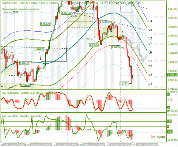 Во вторник курс AUDUSD снизился на 2%. Перед открытием американской сессии пара побывала ниже линии D6. В течение 16 часов быки пытаются восстановить понесенные потери. Пока не восстановили и 20%. Уровень фибо 23,6% проходит через уровень 1,03840. В пятницу в Греции ожидается голосование о вотуме доверия правительству. Если правительство получит вотум доверия, то референдум по вопросу о программе помощи будет проведен в январе 2012 года. Так как снижение AUD вызвано опасения по поводу референдума, то думаю, до пятницы AUD останется под давлением.