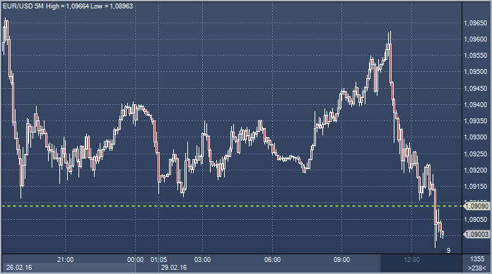 Евро снижается после выхода данных, которые показали, что потребительские цены в еврозоне упали в феврале на 0.2 %, тогда как эксперты прогнозировали отсутствие каких-либо изменений, по сравнению с февралем прошлого года. В январе они выросли на 0,3% в годовом выражении. Индекс цен без учета стоимости продуктов питания и энергоносителей вырос в феврале на 0,7% г/г при прогнозе роста на 0,9% г/г.