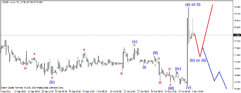 Глоальный нисходящий тренд предположительно завершился.В данный же момент идет развитие либо волны (b) зигзага, либо волны (ii) восходящего импульса. Но так или иначе, в ближайшее время ожидается снижение пары к уровню 77.10