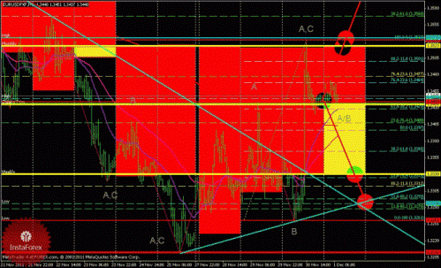 Вчера, 30.11.11, EUR/USD, пробив границу нисходящего наклонного канала (Н4) и защитный пивот 1,3439 (Н1), выросла до значения 1,3532. В результате чего, была сформирована медвежья коррекционная волна В (Н1) и бычья импульсная волна А,С (Н1) в волне А/В (Н4) вверх, а также восходящий наклонный канал (Н1), защищающий движение вверх, и в настоящее время идет формирование медвежьей волны А/В (Н1). При пробое и закреплении цены ниже значения 1,3435 (Daily pivot), ожидаем снижения валютной пары по уровням поддержки, вплоть до значения 1,3330 (Weekly pivot) и границы восходящего наклонного канала (Н1). Скользящие средние 233, 55 и 21 переплелись – флет данного уровня. Пока не пробита граница восходящего наклонного канала (Н1), защищающего движение вверх, восходящая динамика сохраняется.