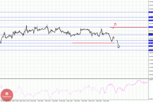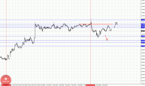 По паре Австралийский доллар/Доллар ключевыми уровнями являются: 1.0362, 1.0289, 1.0257, 1.0230, 1.0084, 1.0011, 0.9977 и 0.9914. Здесь мы следим за формированием нисходящей структуры от 8 декабря, среднесрочная структура для верха от 25 ноября пока актуальна для определения целей. Продолжения движения книзу ожидаем после пробоя 1.0084, в данном случае цель 1.0011, в коридоре 1.0011 – 0.9977 консолидация цены. Потенциальным значением для низа считаем уровень 0.9914, по достижении которого, ожидаем откат к верху. Корректировочное восходящее движение возможно в диапазоне 1.0230 – 1.0257, пробой последнего значения приведет к углубленной коррекции, здесь цель 1.0289. Потенциальным значением для верха считаем уровень 1.0362, до которого ожидаем оформления локальных начальных условий для продолжения восходящей тенденции в масштабе Н1.