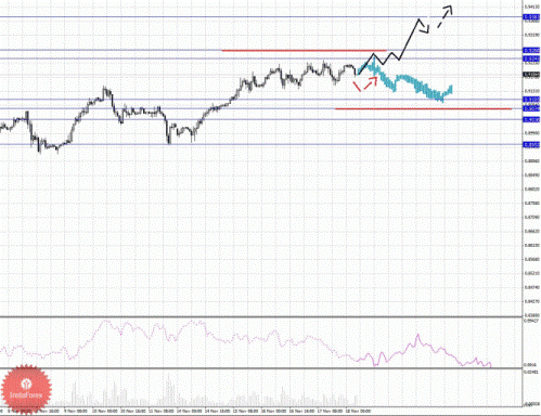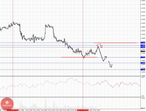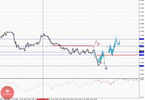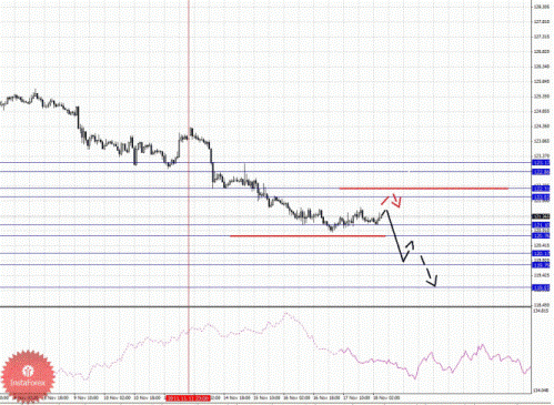 По паре Евро/Доллар пока продолжаем следить за нисходящей структурой, в виду отсутствия каких-либо начальных условий для верха. По паре Доллар/Франк ситуация осталась без изменения. По паре Фунт/Доллар появился небольшой потенциал для восходящей коррекции от 17 ноября, нисходящая структура здесь по-прежнему актуальна для определения целей. Йена прибывает в коридоре. По паре Евро/Йена продолжаем следить за нисходящей структурой от 11 ноября. По паре Фунт/Йена ключевые уровни также остались без изменения. Доу Джонс подошел к ключевой поддержке для верха 11625.