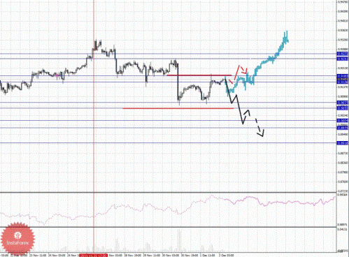 По паре Доллар/Канадский доллар ключевыми уровнями являются: 1.0361, 1.0281, 1.0242, 1.0216, 1.0132, 1.0070, 1.0033 и 0.9955. Здесь продолжения развития нисходящего цикла от 25 ноября ожидаем после пробоя 1.0132, в данном случае цель 1.0070, в коридоре 1.0070 – 1.0033 консолидация цены. Потенциальным значением для низа считаем уровень 0.9955, по достижении которого ожидаем откат кверху. Корректировочное восходящее движение возможно в коридоре 1.0216 – 1.0242, пробой последнего значения приведет к углубленному движению, здесь цель 1.0281, от этого уровня мы ожидаем разворот книзу, его пробой будет располагать к развитию восходящей структуры, в данном случае потенциальная цель 1.0361. До уровня 1.0361 мы ожидаем оформления начальных условий.