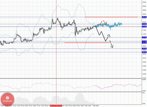 По паре Доллар/Йена ключевыми уровнями являются: 78.29, 77.94, 77.80, 77.26, 77.06, 76.98, 76.69 и 76.51. Здесь, учитывая размер масштабной сетки, мы рассматриваем нисходящую структуру от 29 ноября, в качестве потенциальных начальных условий для развития нисходящего цикла. Продолжения движения книзу ожидаем после пробоя 77.26, в данном случае цель 77.06, возле этого уровня консолидация цены. Проход ценой шумового диапазона 77.06 – 76.98 должен сопровождаться импульсивным движением к уровню 76.69. Потенциальным значением для низа считаем уровень 76.51, по достижении которого ожидаем консолидацию в коридоре 76.69 – 76.51. Краткосрочное восходящее движение возможно в диапазоне 77.80 – 77.94, пробой последнего значения будет располагать к развитию восходящей структуры, здесь потенциальная цель 78.29, до этого уровня мы ожидаем оформления начальных условий для восходящего цикла.