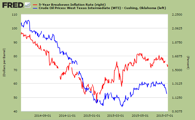 Йеллен также подчеркнула, что пока неясно, будет ли расти инфляция нужными темпами. Поможем старушке – проверим, какие на данный момент инфляционные ожидания. Для этого возьмем разницу между 5 –летними облигациями, защищенными от инфляции (TIPS) и 5-летними treasury. Добавим на график для большей наглядности динамику изменения цен на нефть WTI.