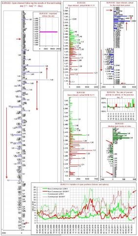 - Комментарий к диаграмме объемов (данные обновляются 1 раз в неделю согласно официальным публикациям сведений о рынке, последние данные от 18.10.11): Объем длинных позиций спекулянтов на историческом минимуме. Этого следует опасаться, тем более что объем длинных позиций хеджеров находится вблизи исторического максимума.