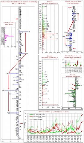 Внимание следует обратить на огромные объемы (выше исторического максимума) длинных позиций коммерческих игроков по EUR, которые хеджируют также огромные объемы коротких позиций спекулянтов. Данные объемы больше тех, которые регистрировались во второй половине мая – начале июня 2010 г. Напомним, что 07.06.2010 пара в ходе «кризиса EUR» достигла минимума и развернулась на фоне экспирации опционных и фьючерсных контрактов, а также на фоне действий ФРС США по предоставлению долларовой ликвидности. Далее важно, что текущие объемы спекулятивных длинных позиций по EUR минимальны по историческим меркам и сравнимы разве что с ситуацией октября 2008 г., когда USD начал демонстрировать ослабление после пика кризиса ликвидности.