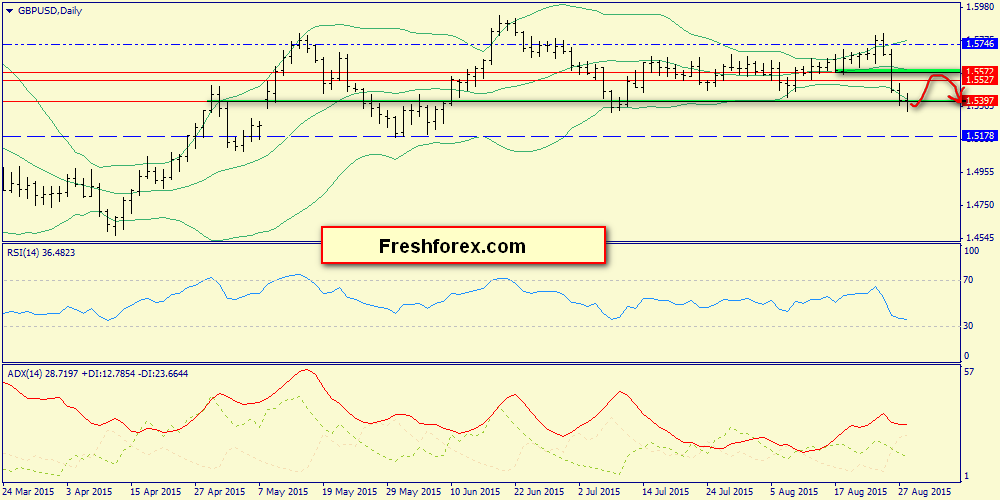 Дневной график: после пробития нижнего конверта, пара идет в коррекцию в направлении средней полосы Боллинджера (1.5572), откуда вновь может быть предпринята попытка снижения в зону 1.54 и затем - к 1.5178 (среднесрочно).