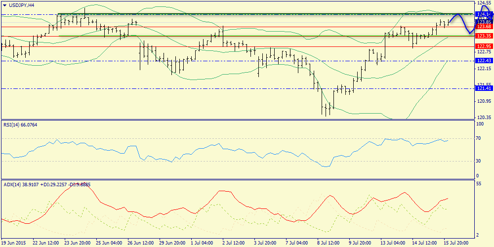 16 июля 2015, USD/JPY. Возможно появление сигналов к продажам в зоне 124.14.