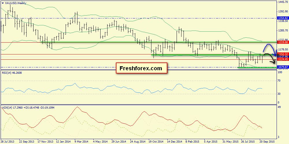 Недельный график: здесь параметры ADX слабые, поэтому есть вероятность, что быки не смогут пробиться выше средней полосы (1152.32). Иначе - будет инициировано движение к 1219.00.