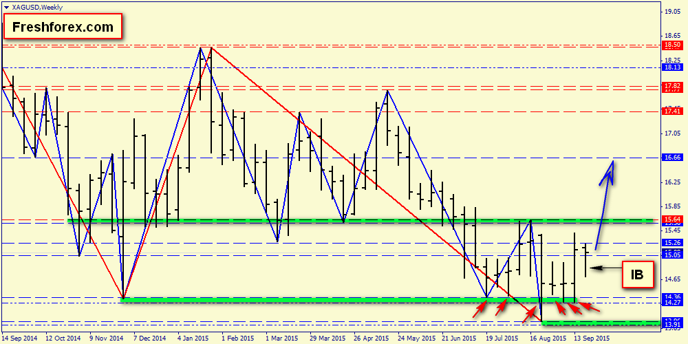 Недельный график: многонедельные попытки продавить зону поддержки 14.27-14.36 привели к единичному понижению на 36 несчастных центов, откуда серебро выпрыгнуло как ошпаренное, сделав на прошедшей неделе внутренний бар с явными признаками наличия присутствия покупателей. Отметим, что в случае роста выше 15.64 будет сформирован бычий Over&Under.