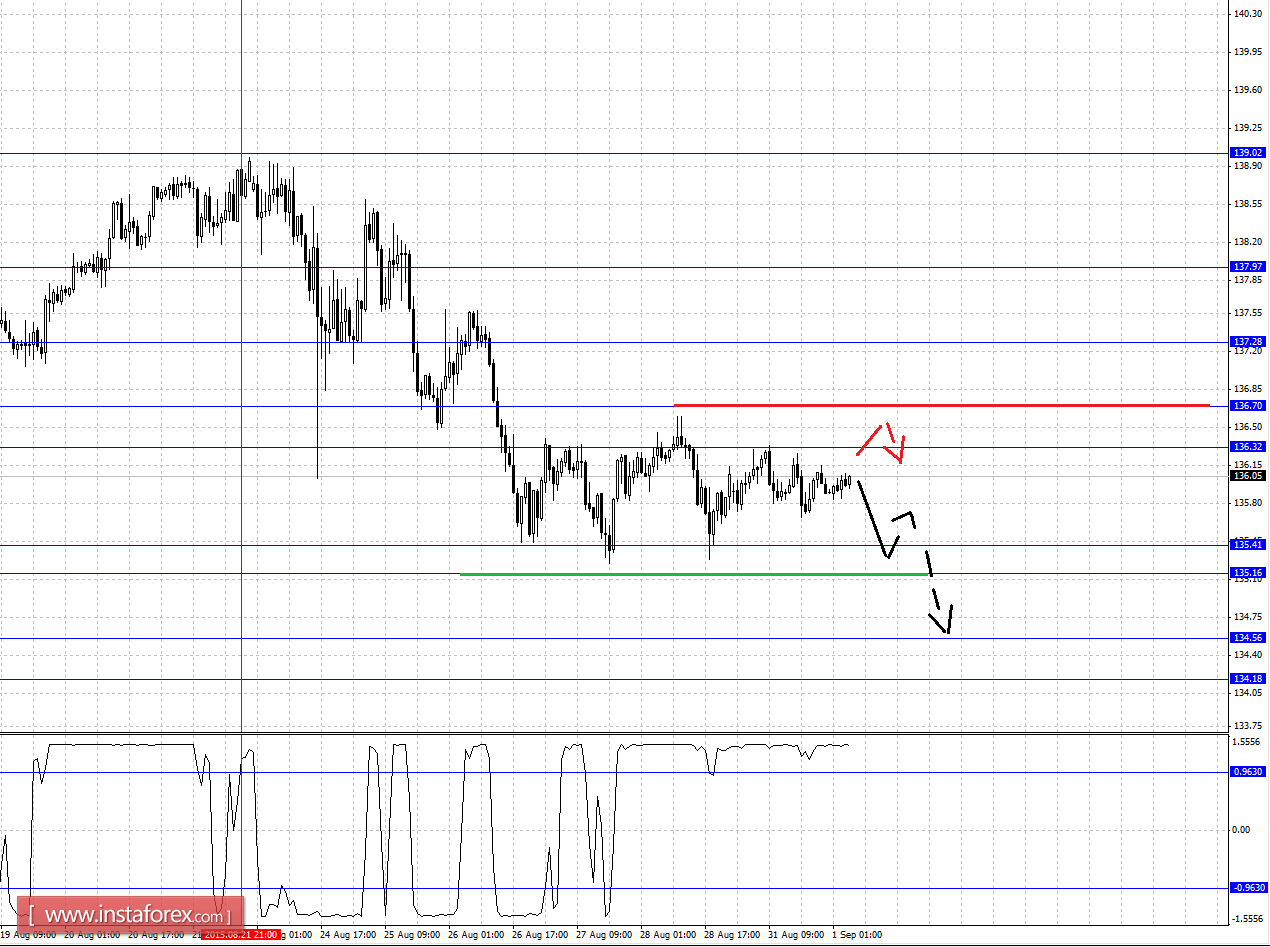 Краткосрочное восходящее движение возможно в коридоре 136.32 - 136.70, пробой последнего значения приведет к углубленной коррекции, здесь цель - 137.25, этот уровень является ключевой поддержкой для нисходящей структуры от 21 августа.