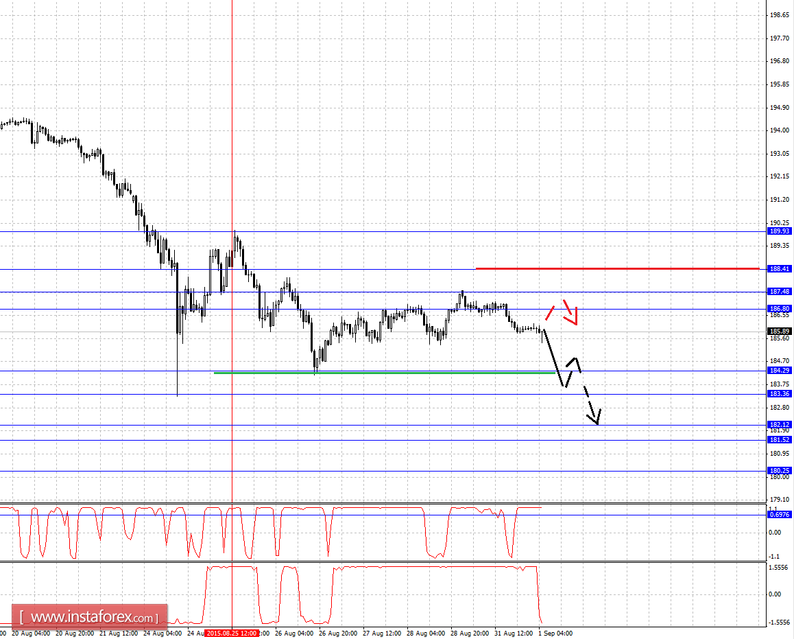 Краткосрочное восходящее движение возможно в коридоре 186.80 - 187.48, пробой последнего значения приведет к углубленной коррекции, здесь цель - 188.41, этот уровень является ключевой поддержкой для нисходящей структуры.