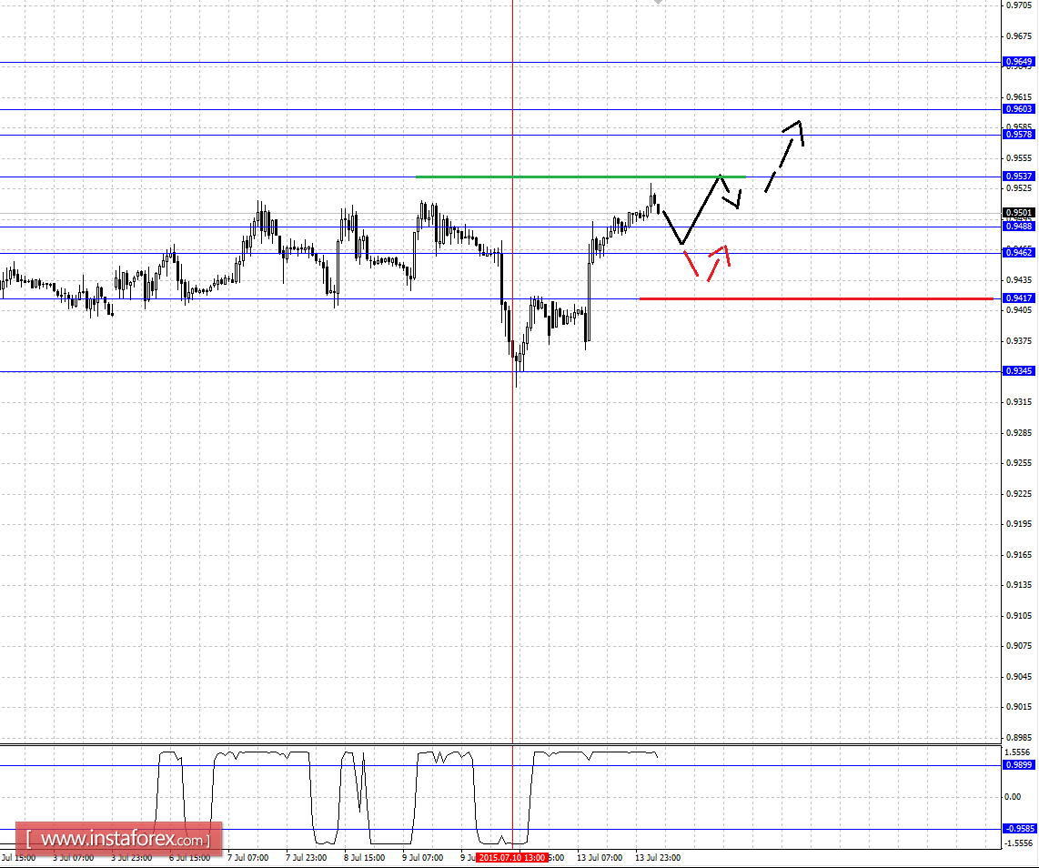 Краткосрочное нисходящее движение возможно в коридоре 0.9488 – 0.9462, пробой последнего значения приведет к углубленной коррекции, здесь цель – 0.9417, этот уровень является ключевой поддержкой для верха.