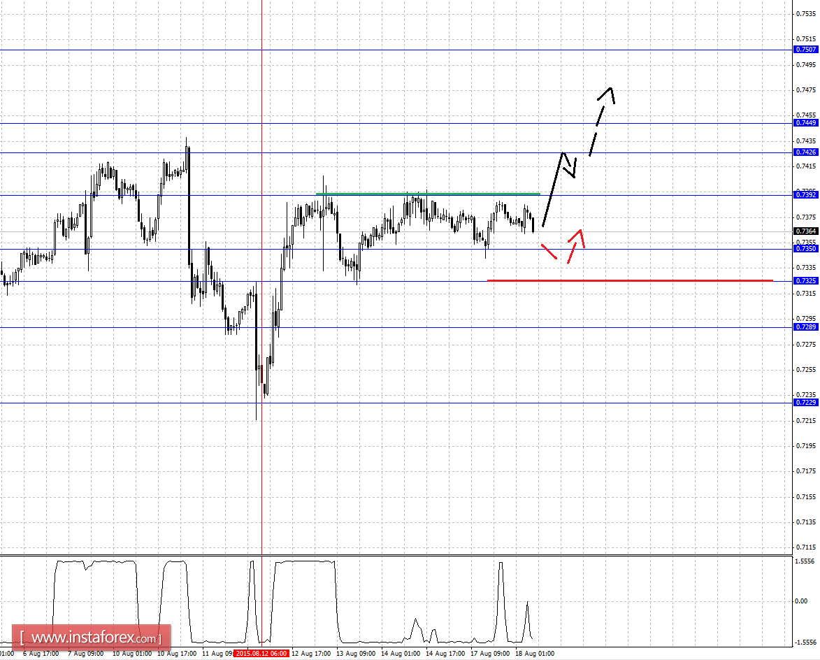 Краткосрочное нисходящее движение возможно в коридоре 0.7350 - 0.7325, пробой последнего значения приведет к углубленной коррекции, здесь цель - 0.7289, этот уровень является ключевой поддержкой для восходящей структуры, его проход ценой будет располагать к развитию нисходящего движения, в данном случае цель - 0.7230.
