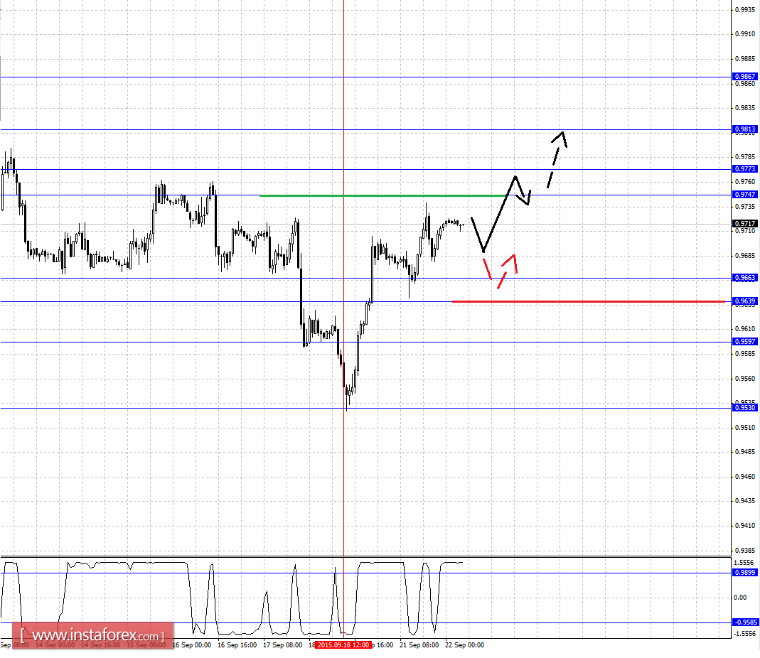 Краткосрочное нисходящее движение возможно в коридоре 0.9663 - 0.9639, пробой последнего значения приведет к углубленной коррекции, здесь потенциальная цель - 0.9600.