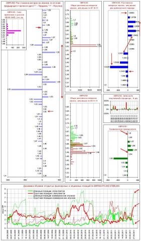- Комментарий к диаграмме объемов (данные обновляются 1 раз в неделю согласно официальным публикациям сведений о рынке, последние данные от 27.09.11): Объем коротких позиций спекулянтов значителен и может подвергнуться коррекции. При этом объем длинных позиций хеджеров близок к историческому максимуму. Ситуация с объемами сравнима с той, которая была сформирована в июне 2010 г.