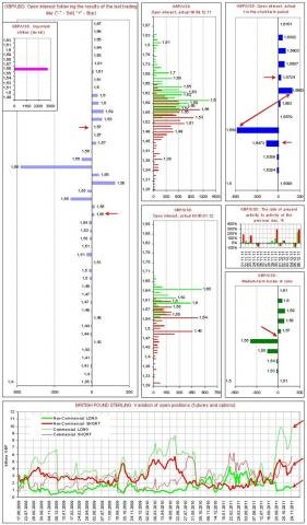 - Комментарий к диаграмме объемов (данные обновляются 1 раз в неделю согласно официальным публикациям сведений о рынке, последние данные от 29.10.11): Внимание следует обратить на огромные объемы длинных позиций коммерческих игроков по GBP, которые хеджируют короткие позиции спекулянтов. Данные объемы сравнимы с историческим максимумом, который регистрировался в октябре 2011 г. и соответствовал по времени построению защиты от падения GBP/USD ниже уровней 1,53 - 1,54. Далее важно, что текущие объемы спекулятивных длинных позиций по GBP близки к минимальным по историческим меркам. Можно ожидать резкой коррекции.