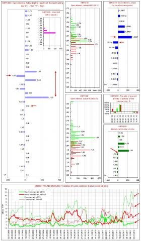 - Комментарий к диаграмме объемов (данные обновляются 1 раз в неделю согласно официальным публикациям сведений о рынке, последние данные от 03.01.12): Внимание следует обратить на огромные объемы позиций коммерческих игроков по GBP. Данные объемы значительно выше исторического максимума, который регистрировался в октябре 2011 г. и соответствовал по времени построению защиты от падения GBP/USD ниже уровней 1,53 - 1,54. Далее важно, что текущие объемы спекулятивных длинных позиций по GBP близки к минимальным по историческим меркам. Можно ожидать усиления волатильности при закрытии позиций.