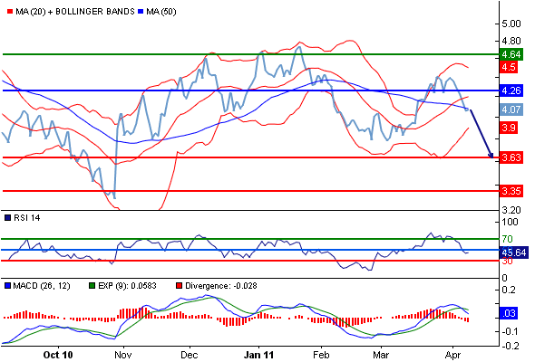 Комментарий : RSI находится ниже нейтральной зоны 50. MACD позитивен и ниже своей сигнальной линии. MACD должен пробить вниз нулевую линию, чтобы потвердить продолжение падения. К тому же курс находится ниже своих 20 и 50-дневных скользящих средних, сейчас располагающихся на уровнях 4.2013 и 4.0832.