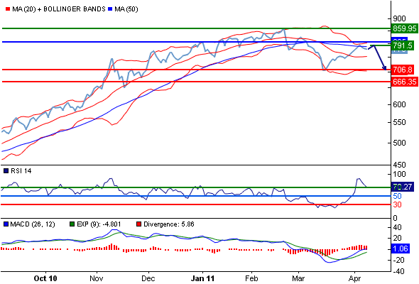 Комментарий : RSI находится выше 70. Это может указать бычий тренд, который продолжится, или же состояние перекупленности, тогда неминуема техническая коррекция. Можно будет сравнить развитие RSI с развитием цен для того, чтобы обнаружить появление расхождений между тем и другим. MACD выше своей сигнальной линии и позитивен. Кроме того, курс находится ниже своей 50-дневной (788.584) но выше своей 20-дневной скользящей средней (752.9125).