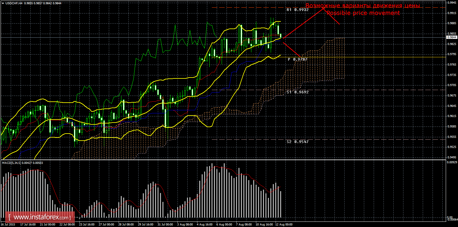 12 августа пара доллар/франк начала виток коррекционного движения и отработала критическую линию, от которой может отскочить и возобновить восходящее движение. Текущий сигнал на покупку - подтвержденный и сильный, так как линия Чинкоу Спан находится выше графика цены, а цена располагается выше облака Ишимоку, поэтому сейчас целью для восходящего движения является первый уровень сопротивления 0,9932. При преодолении первой цели, новым таргетом для восходящего движения станет второй уровень сопротивления 1,0027. Восходящее движение имеет перспективы до тех пор, пока цена находится выше линии Киджун-сен (0,9835), если цена преодолеет критическую линию, текущий «золотой крест» будет ослаблен, а продолжение восходящего движения будет поставлено под сомнение, нисходящее движение сможет попытаться продолжиться с целью нижняя граница облака Ишимоку, а длинные позиции станут не актуальными. Чинкоу Спан находится выше графика цены, что является подтверждением текущего сигнала на покупку и означает "бычье" настроение участников рынка по валютной паре доллар/франк. Боллинджер Бандс показывает продолжение восходящего движения, полосы не расширяются и направлены вверх, поэтому сейчас на рынке по-прежнему актуальны лонги. MACD направлен вверх, что сигнализирует о восходящем движении цены, разворот индикатора вниз может подтвердить начало нисходящей коррекции. Отскок цены от критической линии может засвидетельствовать возобновление восходящего тренда.