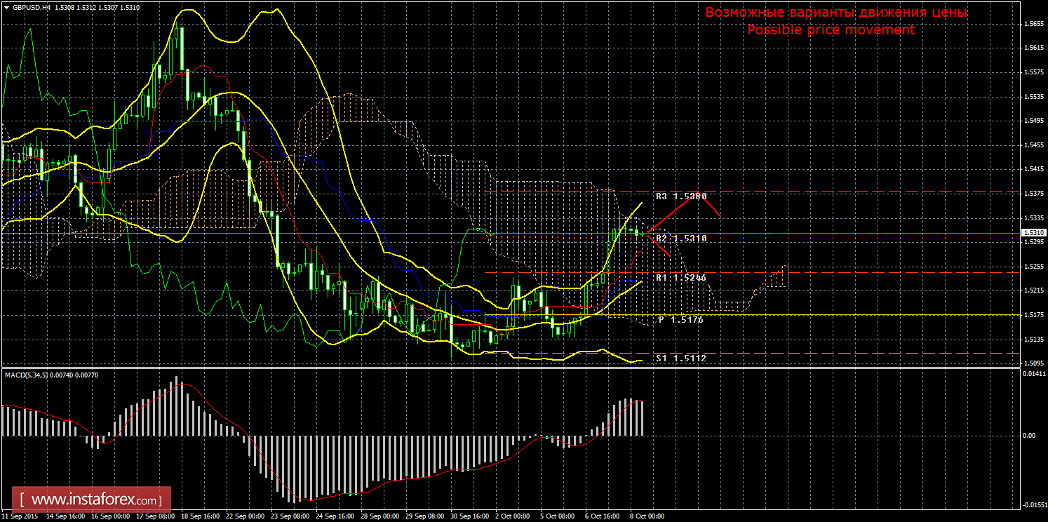 Валютный курс фунта 8 октября продолжает восходящее движение, но по-прежнему располагается внутри облака. Текущий сигнал на покупку подтвержденный и слабый, так как Чинкоу Спан закрепился выше графика цены, а цена располагается внутри облака Ишимоку. На данный момент целью восходящего движения является третий уровень сопротивления 1,5380, но открывать лонги можно будет не ранее закрепления цены выше облака. В случае преодоления первой цели, новым таргетом будет выступать уровень сопротивления старшего таймфрейма 1,5488. Восходящее движение является актуальным до тех пор, пока цена находится выше Киджун-сен (1,5235), если цена закрепится ниже линии Киджун-сен, текущий сигнал будет ослаблен, восходящее движение поставлено под сомнение, а нисходящее движение может попытаться возобновиться с целью первый уровень поддержки 1,5112. Чинкоу Спан находится выше графика цены, что является подтверждением текущего сигнала на покупку и означает "бычье" настроение валютных трейдеров по валютной паре. Боллинджер Бандс показывает продолжение восходящего движения, полосы расширяются и направлены вверх, поэтому сейчас на рынке актуальны длинные позиции, но только после усиления «золотого креста». MACD направлен вверх, что сигнализирует сейчас о текущем восходящем движении цены, разворот индикатора вниз может просигнализировать о начале коррекционного движения. Отскок цены от уровня 1,5310 или линии Сенкоу Спан Б также может спровоцировать виток коррекции.
