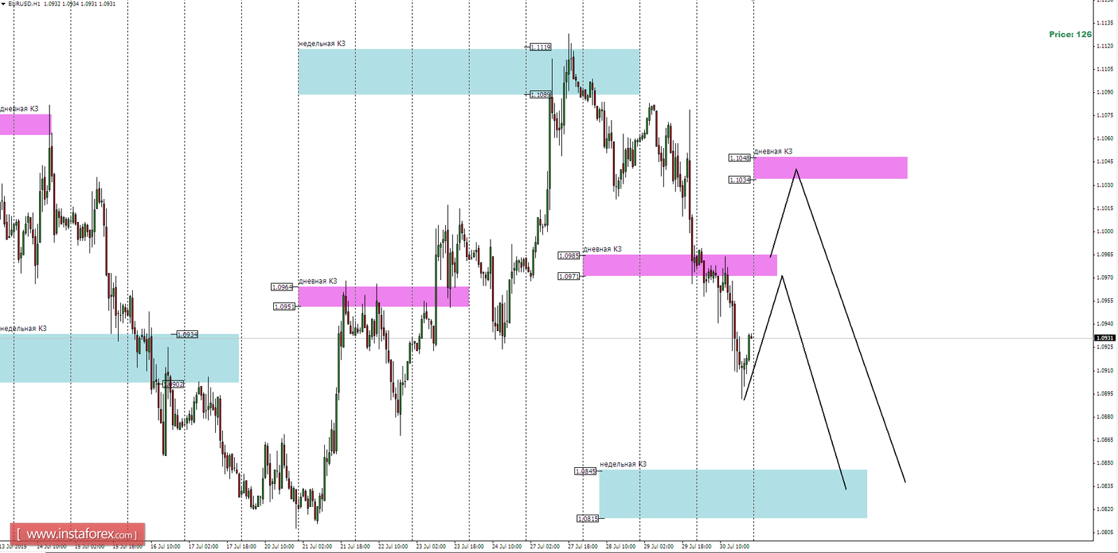 После того как пара резко выросла в начале недели, основным уровнем для ориентира стал максимум прошлой недели. Начиная со среды движение было резко развернуто под действием тендера Центрального Европейского Банка. Дальнейшее падение является приоритетным. Целью нисходящего движения является июльский минимум, расположенный на отметке 1.0808. Компенсаторная модель нисходящего импульса может позволить получить более выгодные цены на продажу инструмента. Уровни сопротивления выгодней всего определять по младшему временному периоду.