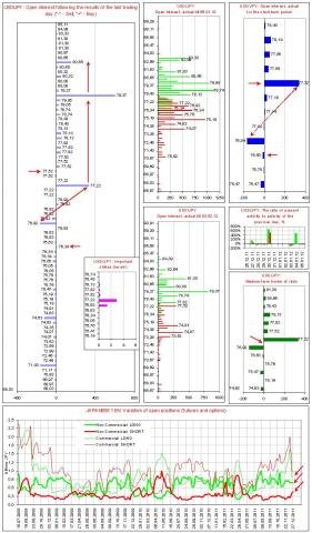 - Комментарий к диаграмме объемов (данные обновляются 1 раз в неделю согласно официальным публикациям сведений о рынке, последние данные от 27.12.11): Длинные позиции спекулянтов продолжают преобладать. Объемы позиций хеджеров резко сократились. Короткие спекулятивные позиции демонстрируют рост.
