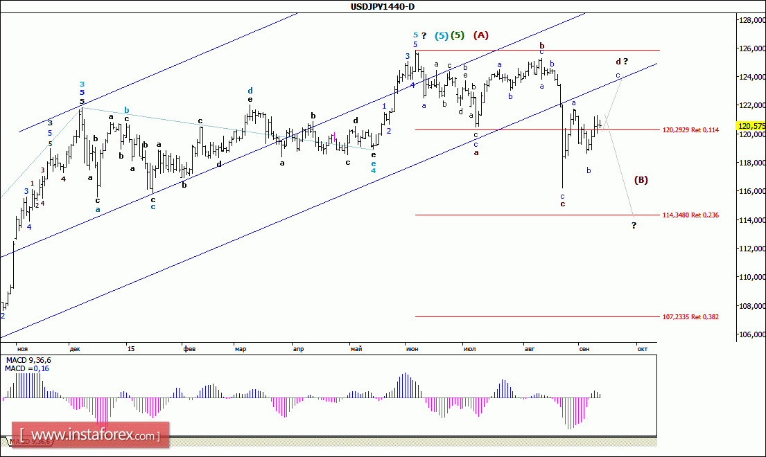 Торги минувшей недели пара USD/JPY начала с отхода от достигнутого ранее минимума и прибавив в цене около 170 б.п., не очень удачно протестировала уровень 120-й фигуры. Сложившаяся при этом волновая ситуация позволяет предполагать, что валютная пара продолжает предпринимать попытки по формированию внутренней волновой структуры волны d, в коррекционной (В), с перспективой роста котировок в район уровня 124,00. В то же время вероятность возобновления нисходящего движения и значительного усложнения волны с, в (В), пока не утратила своей актуальности.