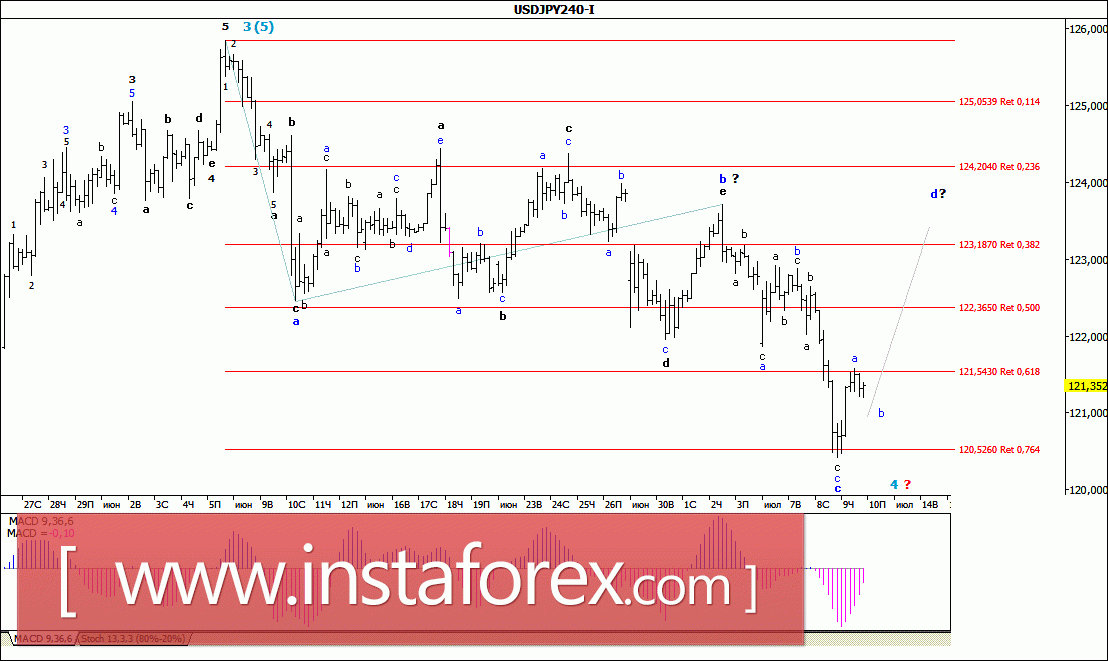 Вчерашние торги пара USD/JPY начала с в общем-то ожидаемого восходящего движения и в середине дня смогла отработать отметку 121,55. При этом можно предположить, что валютная пара, завершив волну с, в 4-й, в (5)-й, обозначила начало будущей волны d, в составе принимающей все более сложную форму 4-й волне. Если это так, то возможные цели для этой волны d могут быть расположены в достаточно широком ценовом диапазоне между уровнями 123-й и 124-й фигур.