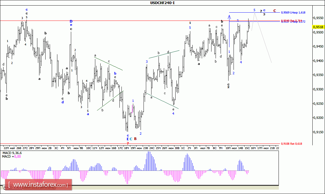 Волновая картина понесла некоторые изменения. В рамках повышательной волны (предположительно С) инструмент продолжает повышение с целями, расположенными вблизи отметок 0,9540 и 0,9612, что соответствует 76,4% и 100,0% по Фибоначчи. В рамках нисходящей волны понижение котировок может начаться с целями, находящимися около расчетных отметок 0,9326 и 0,9285, что приравнивается к 50,0% и 61,8% по Фибоначчи (эти цели еще будут пересмотрены). Волновая разметка может потребовать внесения дополнений и коррективов в любой момент. Неудачная попытка прорыва отметки 0,9540 может привести к построению коррекционной волны.