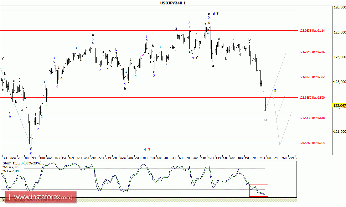 Несмотря на сильную перепроданность индикаторов, в ходе пятничных торгов паре USD/JPY удалось продолжить нисходящее движение и во второй половине дня пробить уровень 122-й фигуры. Сложившаяся при этом волновая картина позволяет предполагать, что валютная пара оставалась в стадии формирования внутренней волновой структуры волны е, в 4-й, в (5)-й. Если это так, то, несмотря сильное удлинение в волне с, в е, в 4-й, цена может продолжить снижение в направлении уровня 121-й фигуры или даже к отметке 120.50, по более сложной траектории.