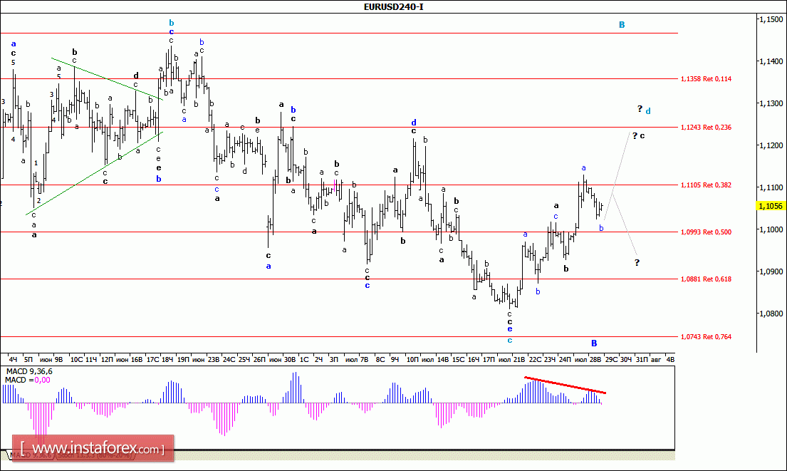 Как и ожидалось, после динамичного роста накануне, вчерашние торги пара EUR/USD начала со снижения и до конца дня «сползла» к отметке 1,1020. Таким образом, можно предположить, что валютная пара оставалась в пределах волновой структуры волны d, в В, в В, формируя ее внутреннюю волну с. Если это так, то от минимума минувшего дня можно ожидать возобновления роста котировок в направлении уровня 13-й фигуры. В то же время, как уже отмечалось ранее, сохраняющаяся дивергенция MACD_ака указывает на возможность продолжения снижения цены, в связи с чем волна d, в В, примет еще более сложную форму.