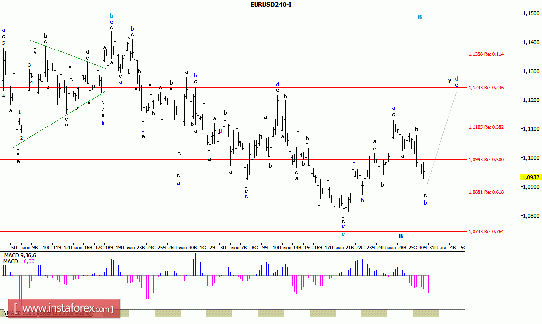 Публикация данных по ВВП США за второй квартал и уточнение в положительную сторону его показателей за первый оказали заметную поддержку доллару, в связи с чем пара EUR/USD продолжила нисходящее движение, протестировав в конце дня уровень 09-й фигуры. При этом, в результате такого снижения, внутренняя волновая структура волны b, в d, в В, в В, приняла вполне завершенный вид. Если это так, то от достигнутого вчера минимума, или при повторной попытке преодоления уровня 1.0900, валютная пара может возобновить рост котировок и перейти в стадию формирования волны с, в d, в В.