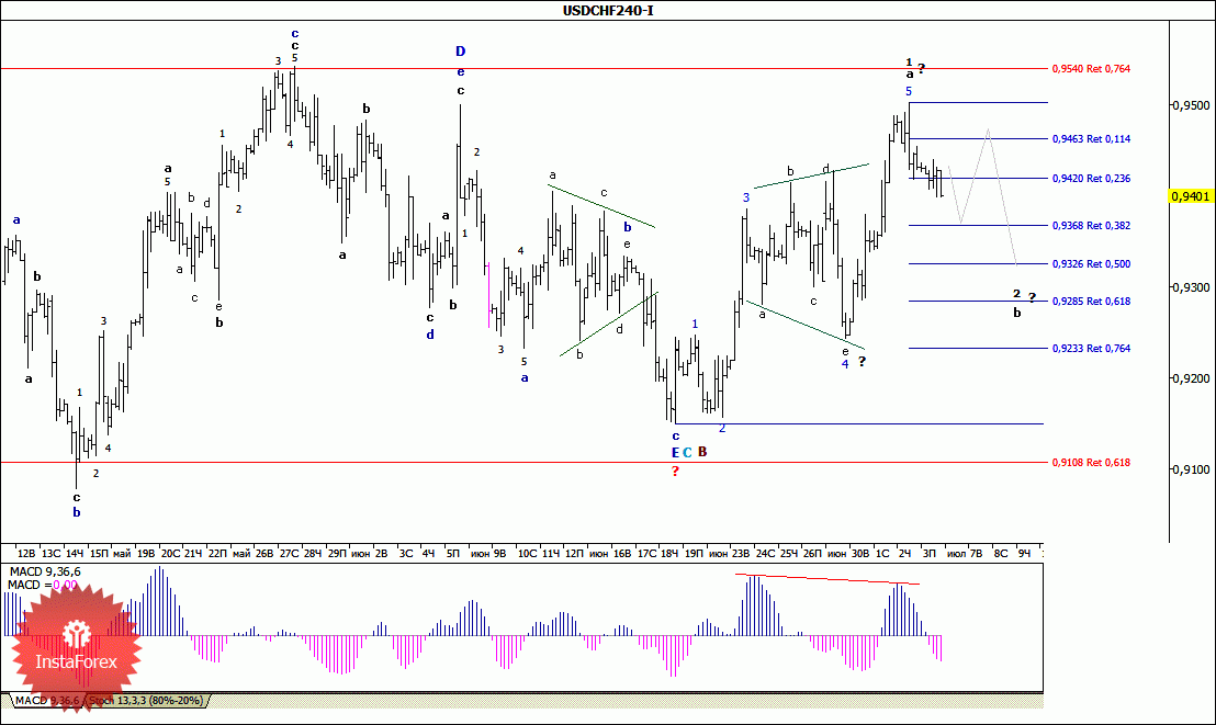 В целом, как и ожидалось, отрабатывая дивергенцию MACD_ака, в последний день минувшей недели пара USD/CHF продолжила медленное снижение и в конце дня протестировала уровень 94-й фигуры. Складывающаяся при этом волновая ситуация позволяет предполагать, что валютная пара находится в стадии формирования коррекционной 2-й волны, или b, развивающейся по отношению ко всей размерности 1-й волны, или а. Если это так, то, скорее всего, цена продолжит снижение к коррекционному уровню 50.0%, хотя и по более сложной траектории.