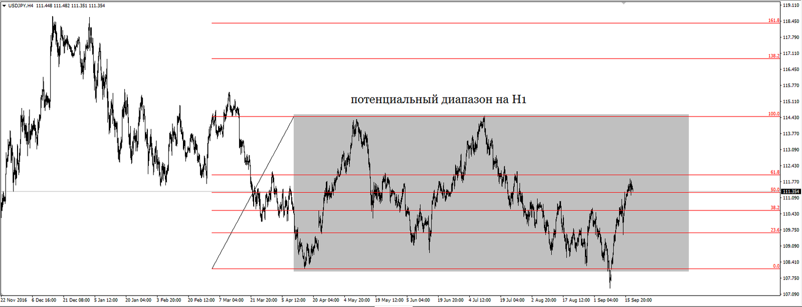 Сейчас пара USD/JPY находится на отметке 111,50, т.е. 50,0% по Фибоначчи. Я писал ранее, что после заседания ФРС собираюсь рассмотреть сделку на покупку, если Федерзверв не поднимет ключевую ставку и смягчит риторику по циклу повышения ставки. Сценарий, при котором буду подключаться на покупку, я описал вчера: