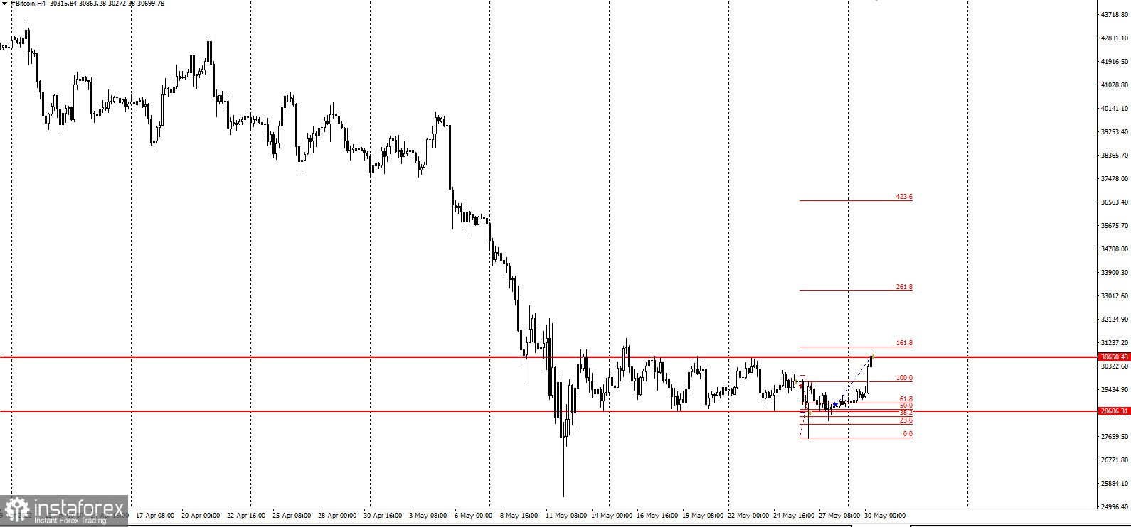 Итак, в пятницу мы давали торговую идею на повышение курса Bitcoin после ложного пробоя 28600 с целью отработки верхнего диапазона канала и захвата стопов продавцов за уровнем 30600: