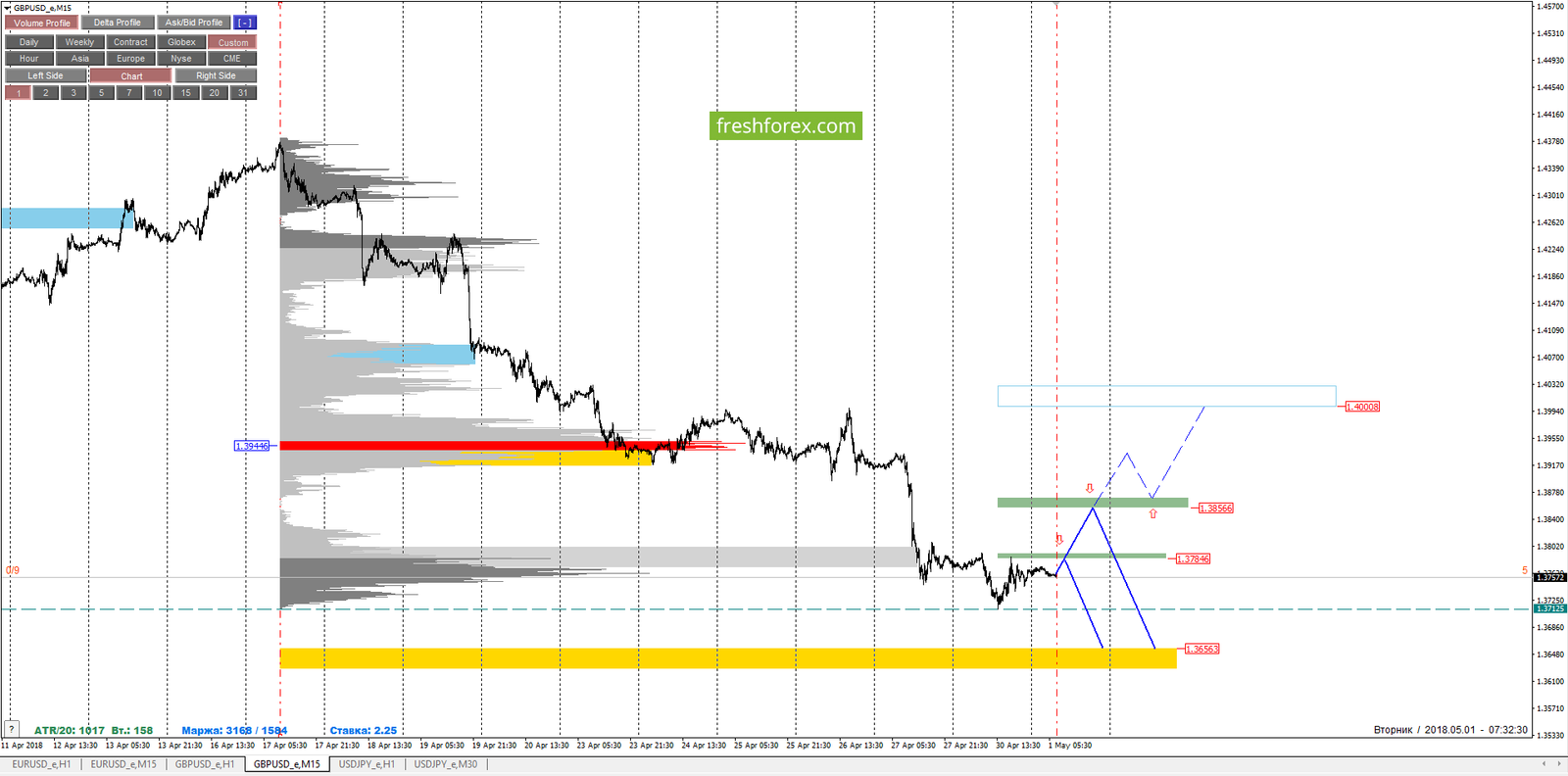 Также наблюдаем рост объемов по котировке 1.37602. Область самых выгодных цен на продажу с точки зрения зон маржинального обеспечения строится от минимума 30.04.2018. Котировки нижней границы зоны 1/4 - 1.37846, котировки нижней границы зоны 1/2 - 1.38566.