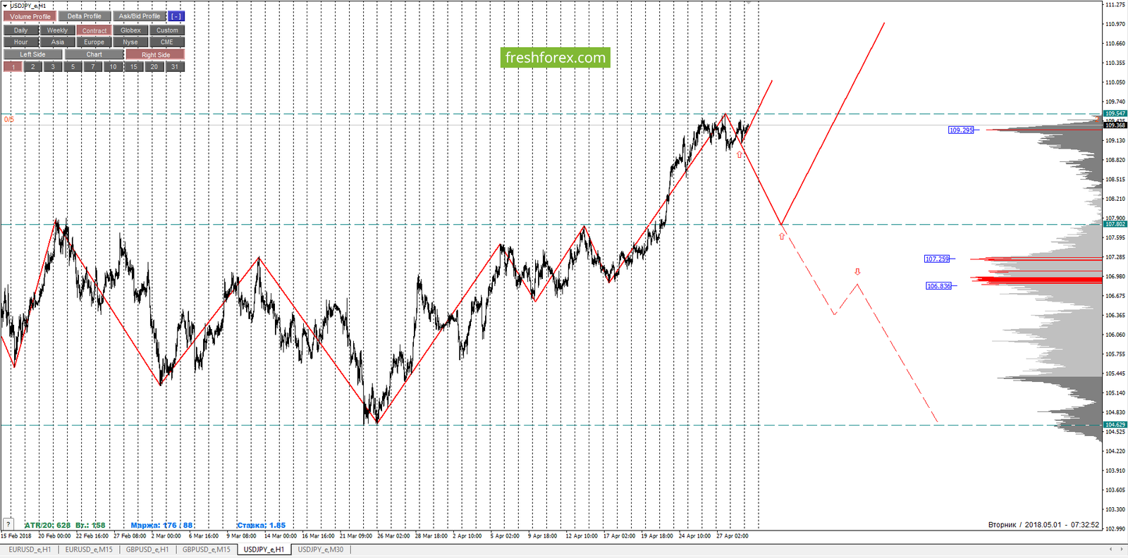 Внутридневные цели: обновление максимумов от 27.04.2018 (109.543), среднесрочные цели: тест нижней границы ЗНКЗ (110.337).