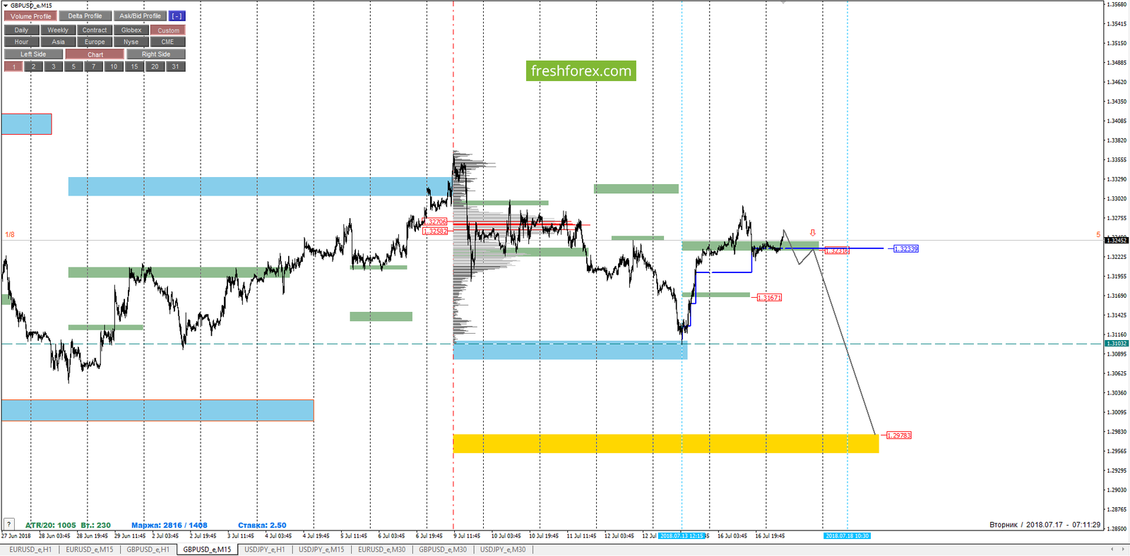 Внутридневные цели: обновление минимума от 13.07.2018 - 1.31032, среднесрочные цели: тест верхней границы ЗНКЗ - 1.29783. Внимательно смотрим за уровнем DPOC, который в настоящее время находится на уровне 1.32339.