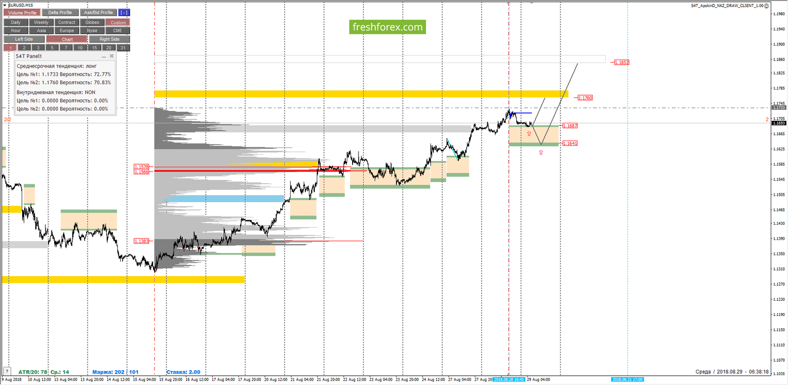 Внутридневные цели: обновление максимума от 28.08.2018 - 1.1733, среднесрочные цели: тест нижней границы ЗНКЗ – 1.1760.