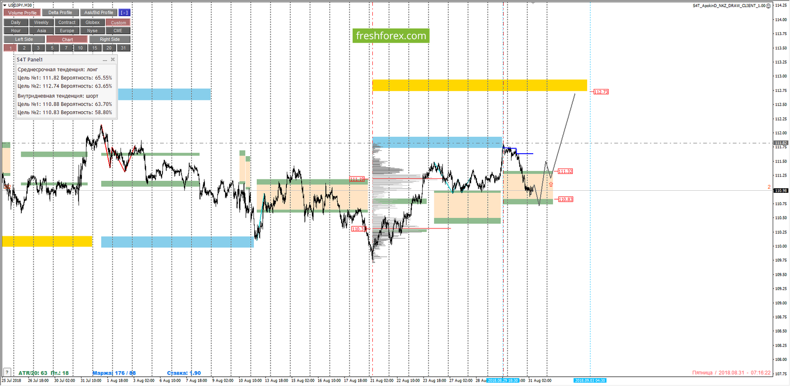Область самых выгодных цен на покупку с точки зрения зон маржинального обеспечения строится от максимума 29.08.2018. Котировка верхней границы зоны 1/4 – 111.32, котировка верхней границы зоны 1/2 – 110.83. Закрытие дня было ниже зоны 1/4, имеем большую вероятность тестирования зоны 1/2.